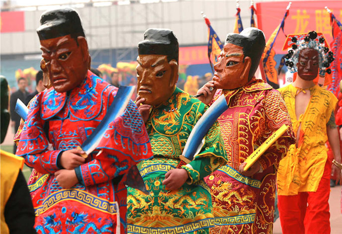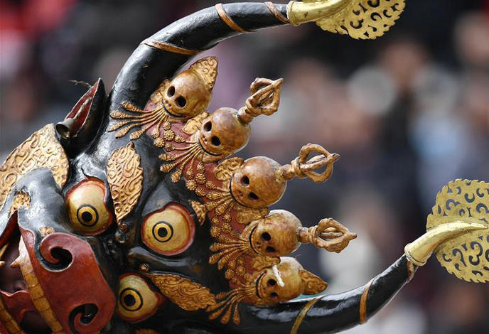 Masked religious dance 'Tiaoqian' performed in NW China's Qinghai