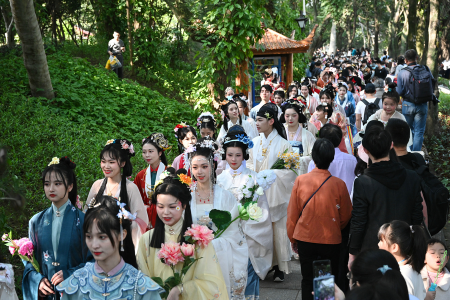 Women in costume celebrate Huazhao Festival, a traditional flower festival, in Fuzhou, Fujian province on March 14, 2021. [Photo/Xinhua]