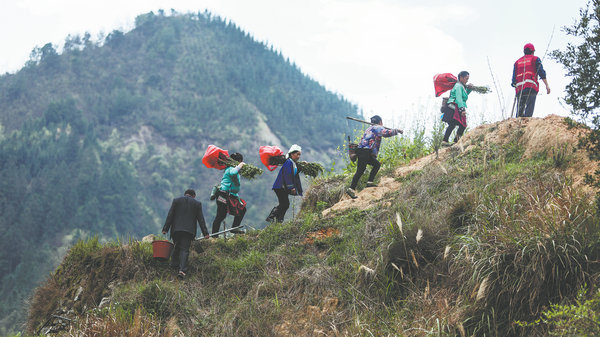 With saplings on their shoulders, villagers climb a steep hill to plant trees in Wuying, a village with a large population of the Miao ethnic group, which nestles snugly between the towering mountains stretching across the border between the Guangxi Zhuang autonomous region and Guizhou province. [Photo/Xinhua]