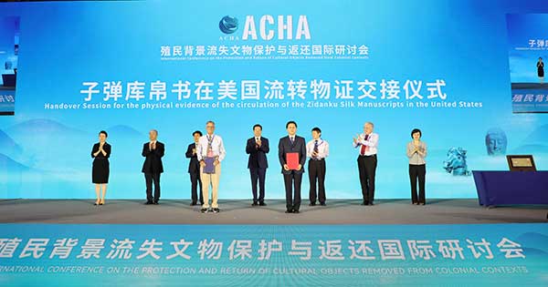 A significant moment at the conference was the ceremonial transfer of physical evidence pertaining to the Zidanku Silk Manuscripts, once illicitly taken to the US in the 1940s. This invaluable manuscript, originating from the Warring States Period (475-221 BC), was returned from the University of Chicago to China, marking a pivotal step in rectifying historical cultural transgressions.