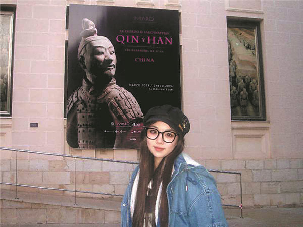 Chen Simo poses for a photo beside a poster of The Legacy of the Qin and Han Dynasties exhibition at the Archaeological Museum of Alicante, Spain, on Jan 13, 2024. [Photo provided to China Daily]